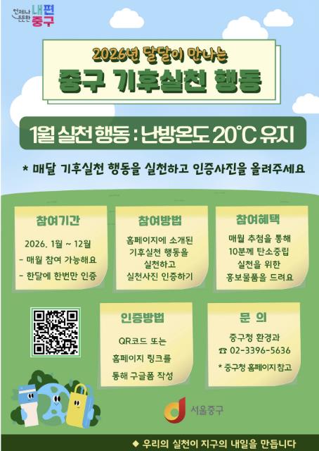 [메이저뉴스]서울 중구가 올해부터 '달달이 기후실천 행동'을 운영하며 주민들의 녹색생활 실천의지를 북돋는다. 올해 첫 미션은 ‘난방온도 20℃ 유지하기’고, 다음달 미션은 '대중교통 이용하기'다.