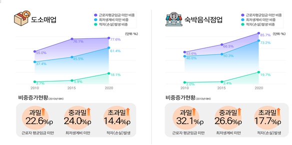 핵심 수치로는 2020년 기준 도소매업의 평균 영업이익은 2,520만원으로 근로자 평균임금 미만 사업체 77.6%, 최저생계비 미만 61.4%, 손실 발생 18.1%로 나타났으며, 숙박음식점업의 평균 영업이익은 1,000만원으로 근로자 평균임금 미만 사업체 85.7%, 최저생계비 미만 73.2%, 손실 발생 19.7%로 나타나 도소매업보다 더 취약한 양상을 보였다.