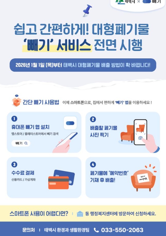 [메이저뉴스]태백시는 2026년 1월 1일부터 대형폐기물 배출 신청부터 수수료 결제, 처리 결과 확인까지 전 과정을 스마트폰 앱 ‘빼기’를 통해 원스톱으로 처리할 수 있는 서비스를 본격 시행한다고 밝혔다.