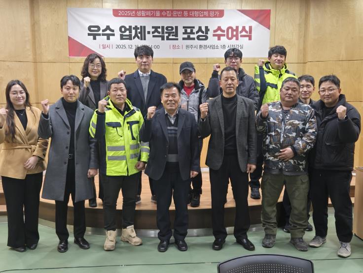 [메이저뉴스]원주시는 12월 16일 '2025년 생활폐기물 수집ㆍ운반 대행업체 평가결과'에 따른 우수등급 업체 및 소속 직원을 대상으로 원주시장 상장 및 표창장을 수여한다.
