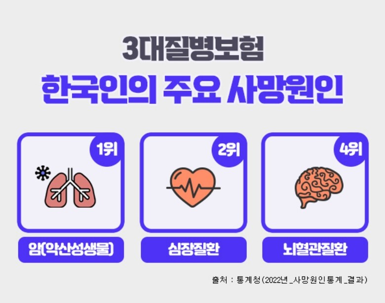 [메이저뉴스]흔히 3대질병이라 일컫는 암, 심혈관질환, 뇌혈관질환은 통계청 발표자료에 따르면 한국인의 주요 사망원인 중에서 3위 폐렴을 제외하고 1~4위를 차지하고 있으며, 이전부터 지금까지도 살면서 가장 먼저 대비해야 하는 치명적인 질병으로 강조되고 있다. 이러한 중대질병에 대비하기 위하여 상기 세가지 치명적인 질병을 집중보장하는 3대질병진단비보험을 많이 가입하고 있다. 3대진단비보험은 각각의 질병을 중점적으로 보장하면서도 가입자 특성에 맞는 특약을 추가함으로써 종합건강보험으로도 활용할 수가 있다.