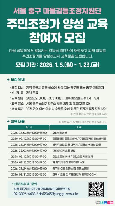 [메이저뉴스]서울 중구가 주민 스스로 갈등을 조정하고 마을의 신뢰를 회복할 수 있도록 돕는 ‘주민조정가’를 양성해 따뜻한 공동체 문화를 만들어가고 있다. 구는 2024년 마을갈등조정지원단 제1기 주민조정가에 이어, ‘제2기 주민조정가 신규 양성 교육’에 참여할 교육생을 공개 모집한다.