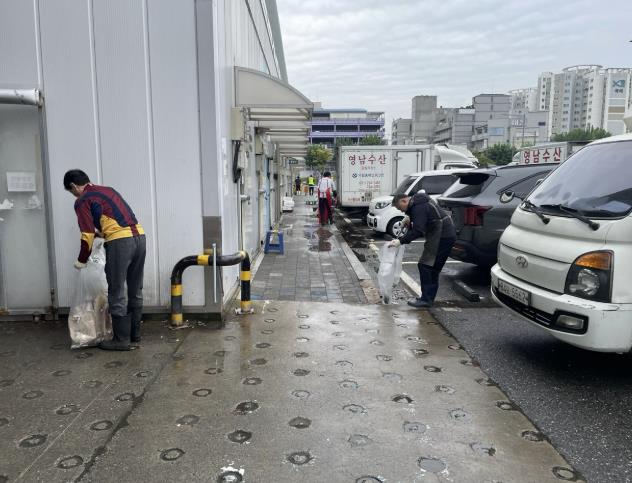 도매시장 보도와 차도, 지상·지하 주차장, 녹지공간, 흡연부스 등 이용객이 많이 찾는 구역을 청소했다. 법인·조합별로 책임 구역을 나눠 쓰레기를 수거했다.
