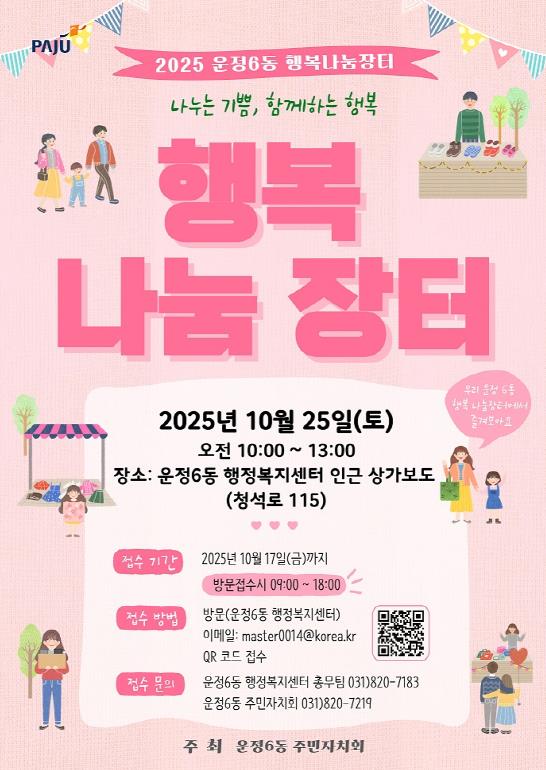 [메이저뉴스]파주시 운정6동 주민자치회는 오는 25일 10시부터 13시까지 운정6동 행정복지센터 앞에서 주민과 함께하는 ‘제3회 행복나눔장터’를 개최한다.