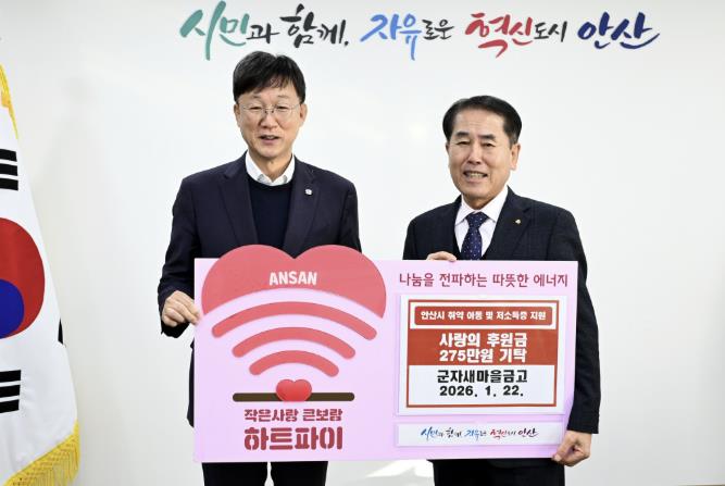 [메이저뉴스]안산시는 지난 22일 군자새마을금고로부터 사랑의 후원금 275만 원을 기탁받았다고 23일 밝혔다.