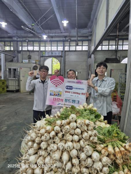 | ▲ 노영현 반월농산 대표(가운데)가 취약계층을 위해 알타리 1,000kg을 후원하고 있다. |