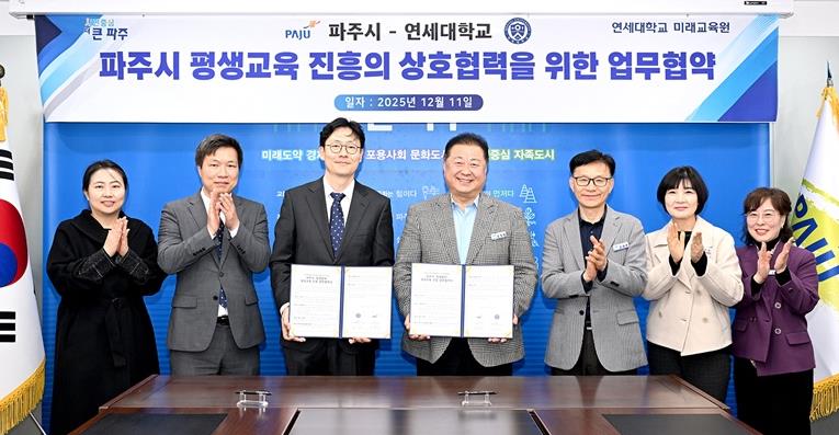 [메이저뉴스]파주시는 지난 11일 연세대학교 미래교육원과 ‘일생일대 프로젝트’의 공동 기획·운영을 위한 평생교육 진흥 업무협약(MOU)을 체결하고, 2026년 사업 확대를 위한 협력 체계를 본격 가동했다.