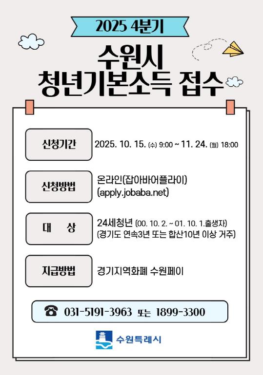 [메이저뉴스]수원특례시는 10월 15일 오전 9시부터 11월 24일 오후 6시까지 24세 청년을 대상으로 ‘2025년 4분기 청년기본소득’ 신청을 받는다.