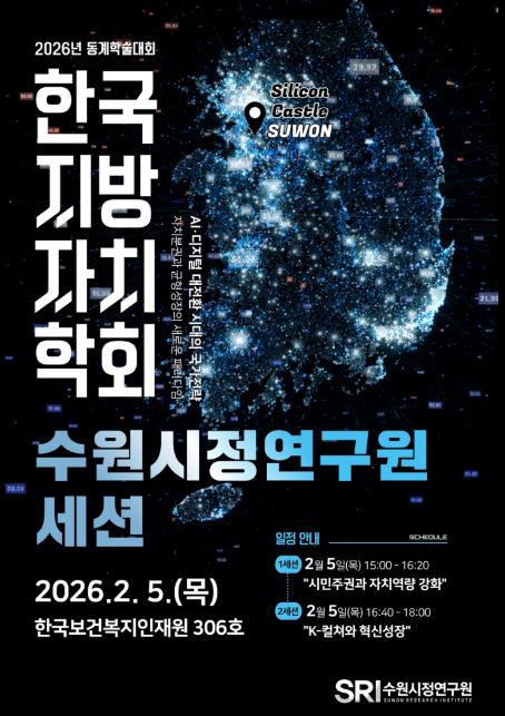 [메이저뉴스]수원시정연구원은 오는 2월 5일(목) 충북 청주 오송 한국보건복지인재원에서 열리는 2026년 한국지방자치학회 동계학술대회에서 수원시의 대표 혁신 정책과 미래 성장 전략을 주제로 한 세션을 개최한다고 2월 2일 밝혔다.