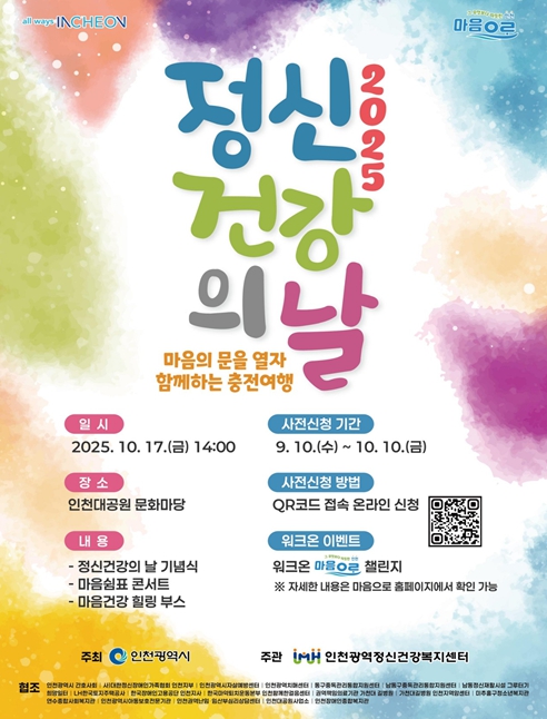 [메이저뉴스]인천광역시는 10월 17일 인천대공원 문화마당에서 ‘마음의 문을 열자, 함께하는 충전 여행’이란 주제로‘2025년 정신건강의 날 기념행사’를 개최한다.