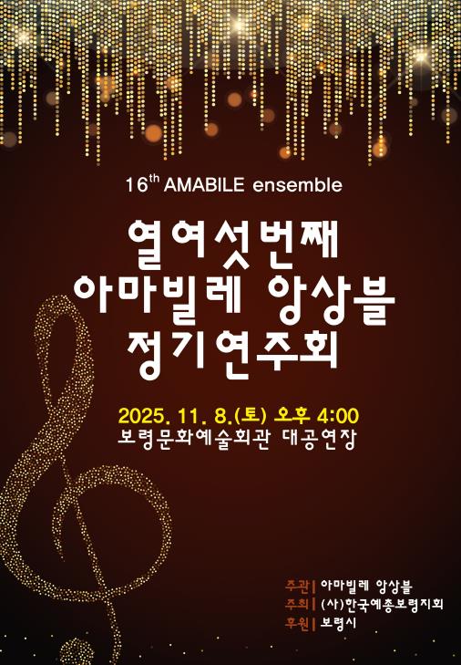 [메이저뉴스]보령시는 아마빌레 앙상블이 오는 11월 8일 보령문화예술회관 대공연장에서 제16회 정기연주회를 개최한다고 밝혔다.
