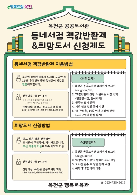 이와 함께 운영 중인 ‘희망도서 신청제도’는 군민이 읽고 싶은 도서를 옥천군 공공도서관 홈페이지를 통해 신청하면, 선정 절차를 거쳐 분기별로 비치되는 제도이다.