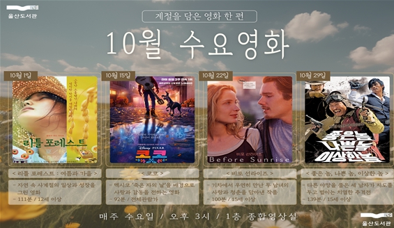 [메이저뉴스] 울산도서관이 10월 한 달간 매주 수요일 오후 3시 도서관 1층 종합영상실에서 ‘계절을 담은 영화 한 편’을 주제로 영화를 상영한다.