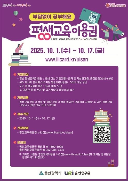 울산시는 ‘2025년 평생교육이용권’ 지원사업의 3차 신청 접수를 10월 1일부터 17일까지 평생교육이용권 누리집을 통해 실시한다고 밝혔다.