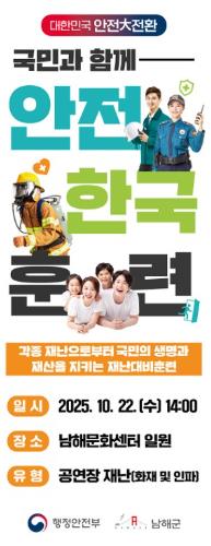 [메이저뉴스]남해군은 각 기관의 협업체계와 현장 대응능력을 점검하기 위해 오는 10월 22일 남해문화센터 일원에서 ‘2025년 재난대응 안전한국훈련’을 실시한다고 밝혔다.