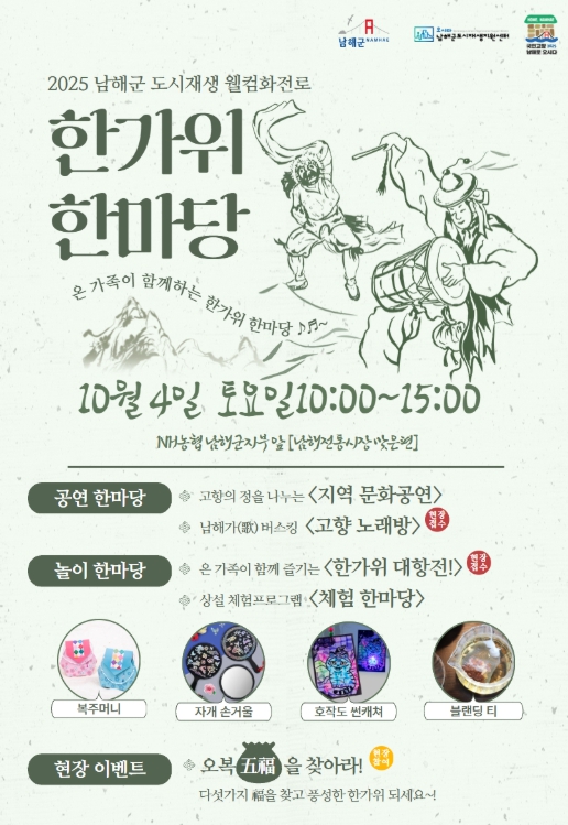 [메이저뉴스]남해군도시재생지원센터는 추석연휴를 맞아 오는 10월 4일 NH농협 남해군지부 앞(전통시장 맞은편)에서 ‘한가위 한마당’ 행사를 개최한다고 밝혔다.