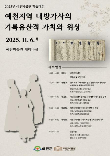 [메이저뉴스]예천군 예천박물관은 11월 6일 오후 2시 ‘예천지역 내방가사의 기록유산적 가치와 위상’이란 주제로 학술대회를 개최한다.