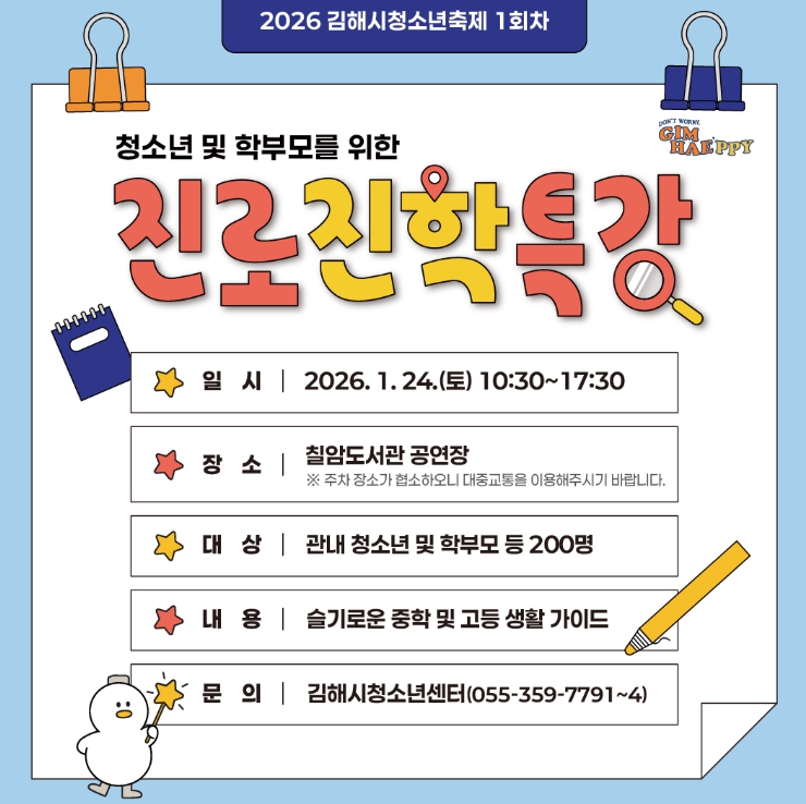 [메이저뉴스] 김해시청소년센터는 오는 24일 칠암도서관 공연장에서 청소년과 학부모를 위한 ‘2026 청소년 진로·진학특강’을 개최한다고