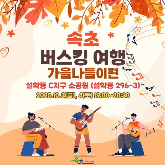 [메이저뉴스]속초시가 추석 연휴의 시작과 함께 시민과 관광객에게 특별한 문화예술 향유 기회를 선사하기 위해 ‘속초 버스킹 여행-가을나들이편’을 오는 10월 3일, 4일 오후 7시부터 8시 반까지 설악동 C지구 소공원에서 선보인다.