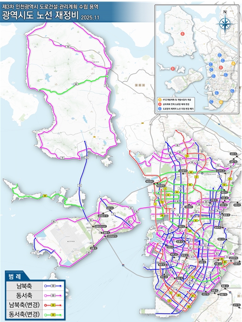 [메이저뉴스]인천광역시는 12월 22일 송도·청라경제자유구역 및 계양 테크노밸리(TV) 개발계획, 고속도로 건설 및 교통혼잡도로 개선사업계획 등 국가 상위계획을 반영해 광역시도 노선 체계를 재정비하여 고시한다고 밝혔다.