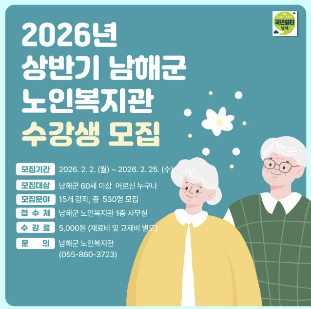 [메이저뉴스]남해군 노인복지관은 2026년 상반기 프로그램 수강생을 2월 2일부터 25일까지 모집한다고 밝혔다.