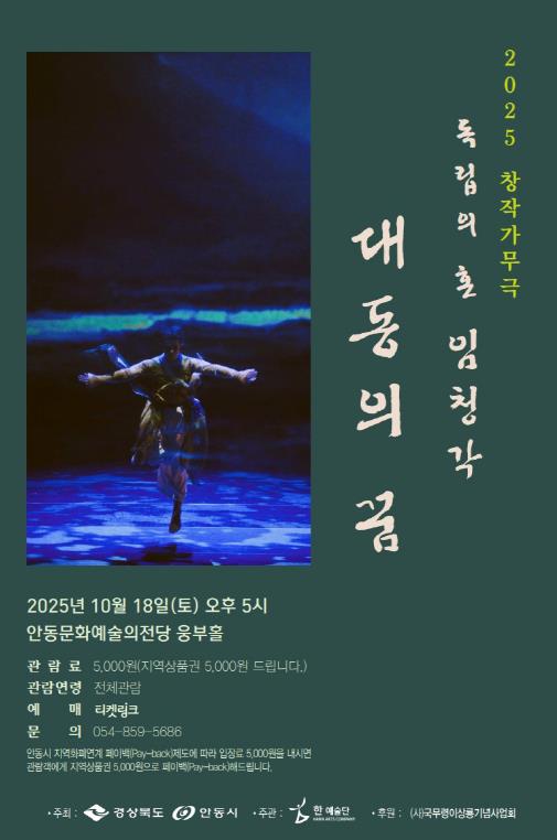 [메이저뉴스]한예술단이 주최․주관하는 '2025 창작가무극 독립의 혼 임청각 ‘대동의 꿈’' 공연이 10월 18일 오후 5시, 안동문화예술의전당 웅부홀에서 개최된다.