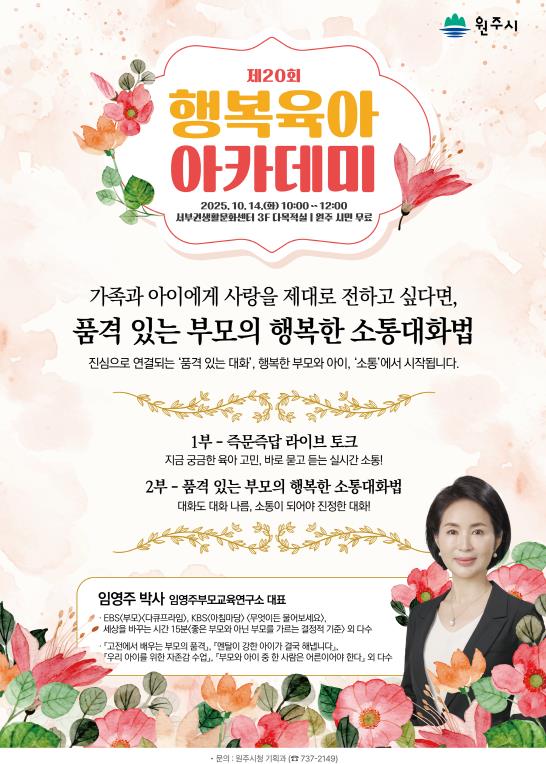 [메이저뉴스]원주시는 10월 14일 오전 10시, 서원주생활문화센터 3층 임영주 임영주부모교육연구소 대표와 함께 ‘제20회 행복육아 아카데미’를 개최한다.