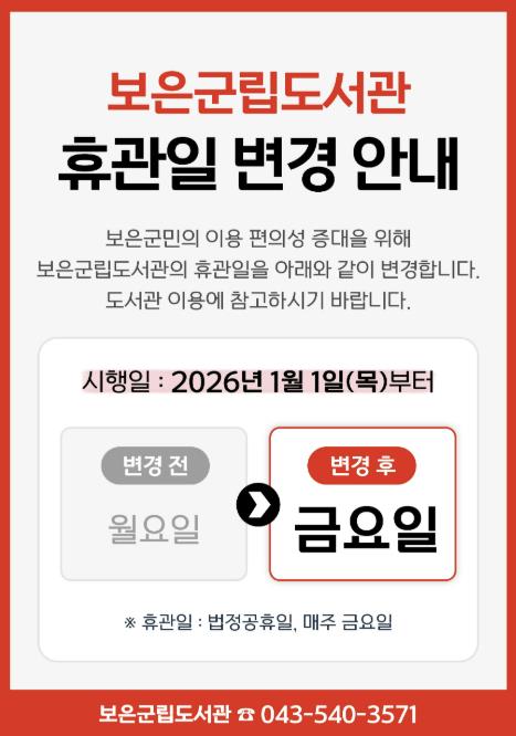 [메이저뉴스]보은군립도서관은 2026년 1월부터 정기휴관일을 기존 매주 월요일에서 금요일로 변경해 운영한다고 밝혔다.