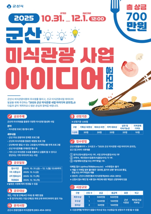 군산시 관계자는 “이번 공모전을 통해 군산의 맛과 관광을 결합한 참신한 아이디어가 발굴되어, 지역경제 활성화와 미식관광도시 군산의 브랜드 가치 제고에 큰 도움이 되길 기대한다.”라고 밝혔다.