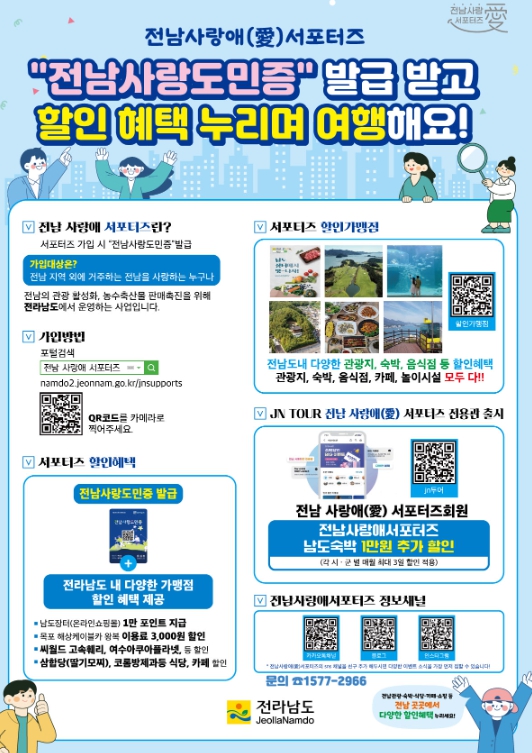 전남 사랑애 서포터즈는 지역 소멸 위기를 극복하고 농특산물 판매 촉진, 관광 활성화를 위해 지난 2022년 9월부터 운영되고 있다. 가입자에게는 전남 도내 관광지, 숙박, 음식점, 전통시장 등 할인가맹점에서 할인 혜택을 받을 수 있는 ‘전남사랑도민증’이 발급된다.