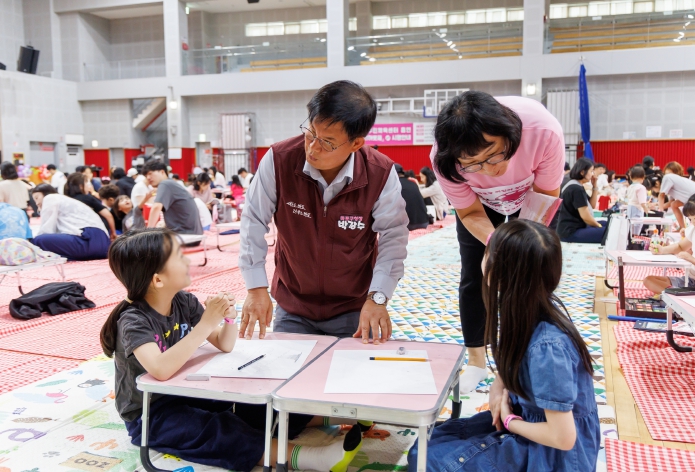 | ▲ 박강수 마포구청장이 그림 그리기 대회에 참석한 어린이와 인사하고 있다. |