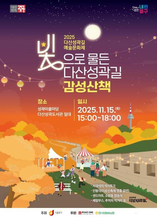 [메이저뉴스]서울 중구는 오는 15일 오후 3시부터 6시까지 다산성곽도서관과 성곽마을마당 일대에서‘2025 다산성곽길 예술문화제’를 개최한다. 중구 역사홍보대사 방송인 서경석 씨의 역사특강부터 청춘인형극단의 인형극, 소망등 점등식, 미리보는 성곽길 감성가로 샌드아트 등 다채로운 프로그램이 가득하다.