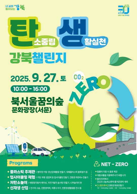 [메이저뉴스]서울 강북구는 오는 9월 27일 오전 10시부터 오후 4시까지 북서울꿈의숲 일대에서 ‘탄생 강북 챌린지(탄소중립 생활실천 강북 챌린지)’와 ‘2025 나눔과 순환의 즐거운 장터’를 개최한다.
