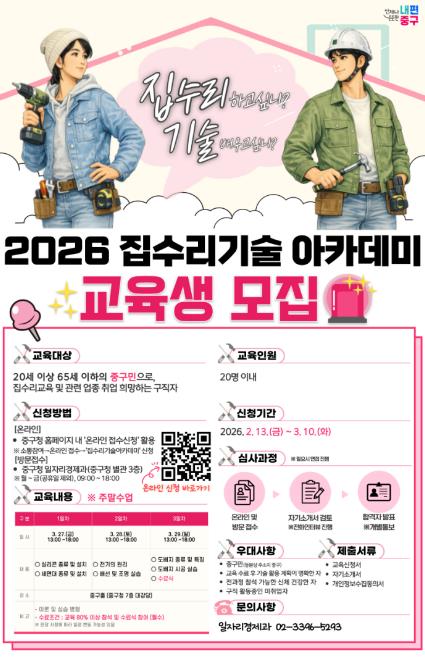 [메이저뉴스]서울 중구가 일상 속 불편을 해결하는 집수리 기술을 배우고, 취업과 창업까지 이어질 수 있도록 돕는 '2026 집수리 기술 아카데미'를 운영한다.