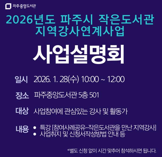 [메이저뉴스]파주시 중앙도서관은 지역의 작가, 예술가, 독서문화 활동가 등 인재를 발굴해 작은도서관의 독서문화 프로그램을 지원하는 녪년 작은도서관 지역강사 연계사업’에 참여할 지역강사를 모집한다.