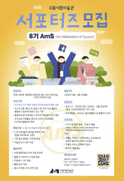 미술관의 참신한 콘텐츠 제작과 청년층의 문화예술 향유 기반을 조성하기 위해 운영되는 제8기 서포터즈 AmS는 2026년 3월부터 8월까지 총 6개월간 활동하게 된다. 총 16명의 대학생과 대학원생을 선발할 예정이며 지역 제한 및 국적 제한은 없다. 미술관 전시와 홍보에 관심이 있으며 활동에 성실히 참여할 수 있으면 누구나 지원 가능하다.