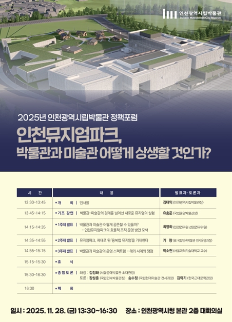 [메이저뉴스]인천광역시 시립박물관은 오는 11월 28일 인천시청 대회의실에서 ‘인천뮤지엄파크, 박물관과 미술관 어떻게 상생할 것인가?’를 주제로 정책 포럼을 개최한다고 밝혔다.