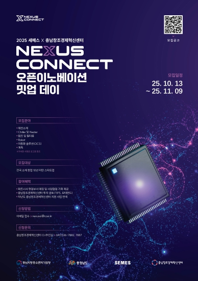 [메이저뉴스](재)충남창조경제혁신센터와 세메스(주)는 반도체·디스플레이 장비 혁신을 이끌 유망 스타트업을 발굴·육성하기 위해 ‘2025 세메스 × 충남창조경제혁신센터 Nexus Connect 오픈이노베이션 밋업 데이’ 참여 기업을 11월 9일까지 모집한다.