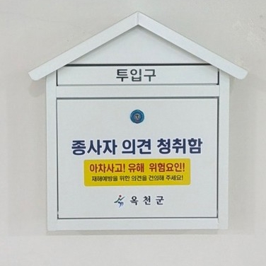 [메이저뉴스]옥천군은 종사자의 안전·보건을 보다 체계적으로 관리하고, 현장의 다양한 목소리를 폭넓게 수렴해 군정에 적극 반영하기 위해 군청 및 읍·면사무소 등 주요 공공시설 16개소에 총 21개의 종사자 의견청취함을 설치·운영한다고 밝혔다.