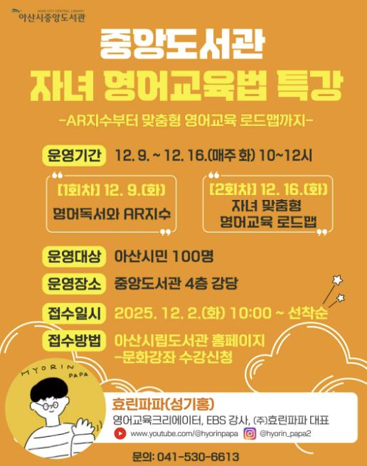 [메이저뉴스]아산시 중앙도서관은 오는 12월 9일과 16일, 두 차례에 걸쳐 영어교육 전문가 효린파파(성기홍)와 함께하는 자녀 영어교육법 특강을 운영한다.