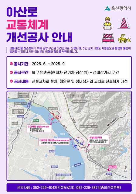 울산시 관계자는 “이번 아산로 교통체계 개선공사는 아산로 일대 교통해소뿐만 아니라, 현대차 전기차 공장 본격 가동에 대비하고, 시민들의 출·퇴근길 불편을 최소화하기 위한 조치”라며, “앞으로도 교통 흐름을 지속적으로 점검해 단계적인 개선을 이어가겠다”라고 말했다.