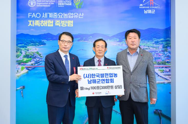 (사)한국쌀전업농 남해군연합회는 2025년 1월 쌀(10kg) 120포를 기탁한 데 이어, 올해도 300만원 상당의 쌀(10kg) 100포를 기탁하며 따뜻한 나눔을 이어갔다.