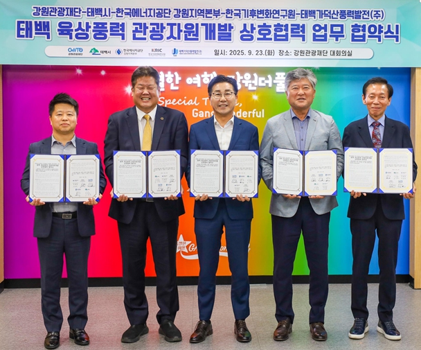 [메이저뉴스]강원관광재단은 지난 9월 23일 태백시, 한국에너지공단 강원지역본부, 한국기후변화연구원, 태백가덕산풍력발전㈜과 함께 ‘육상풍력 관광자원 개발을 위한 상호 협력 협약’을 체결하고 폐광지역 관광의 새로운 미래를 열겠다고 밝혔다.