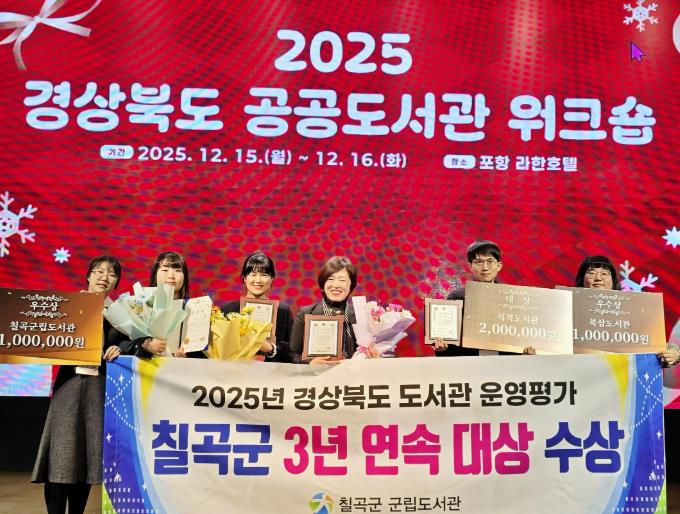 또한 올해 평가에서 칠곡군립도서관(A그룹)은 우수상, 석적도서관(C그룹)은 대상, 북삼도서관(C그룹)은 우수상을 각각 수상하며 칠곡군 도서관 운영의 우수성과 경쟁력을 다시 한 번 입증했다.
