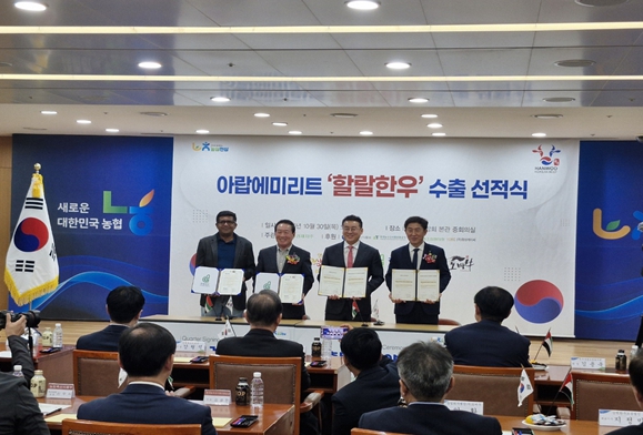 [메이저뉴스]대한민국 축산물 브랜드경진대회에서 2019년, 2021년, 2023년 대통령상을 수상한 강원특별자치도 통합브랜드 ‘강원한우’가 10월 30일 서울 농협중앙회 본관에서 ‘강원한우 아랍에미리트(UAE) 수출 선적식’을 개최했다.