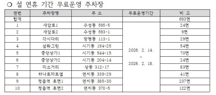 | ▲ “설 명절 주차 걱정 덜어드려요”… 정읍시, 공영주차장 10곳 무료 개방 |