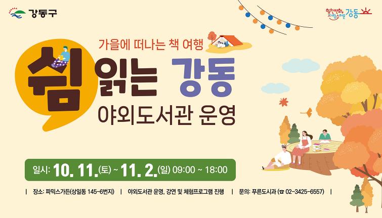 [메이저뉴스]강동구는 10월 11일부터 11월 2일까지 한 달간 파믹스가든(상일동 145-6)에서 주말 야외 도서관 '쉼 읽는 강동'을 운영한다고 밝혔다.