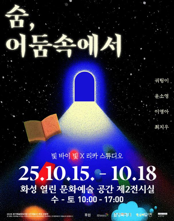 [메이저뉴스]화성특례시와 화성시문화관광재단이 추진하는 ‘2025 모든예술31 화성’ 사업에 선정된 '숨, 어둠속에서'가 오는 10월 15일부터 10월 18일까지 화성 열린 문화예술 공간 제2전시실에서 개최된다. 이번 전시는 미디어아트를 활용한 몰입형 전시로, 오전 10시부터 오후 5시까지 진행되며 누구나 무료로 관람할 수 있다.