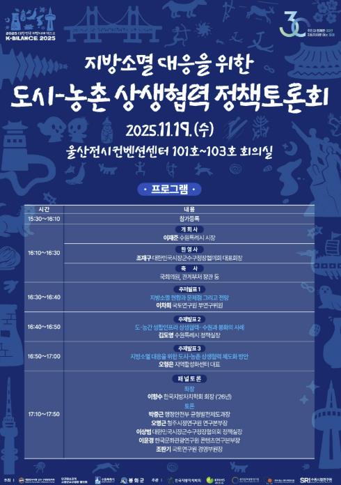 수원특례시(시장 이재준)는 11월 19일 오후 4시 울산전시컨벤션센터 1층에서 ‘지방소멸 대응을 위한 도시–농촌 상생협력 정책토론회’를 개최한다.
