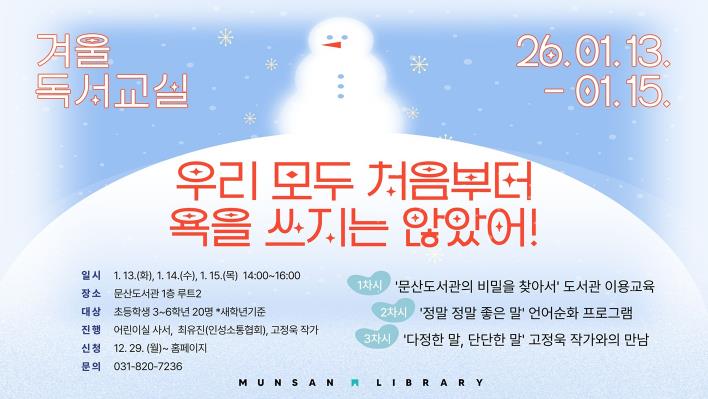 [메이저뉴스]파주시 문산도서관은 오는 13일부터 15일까지 사흘간 2026년 문산도서관 겨울독서교실을 운영한다.
